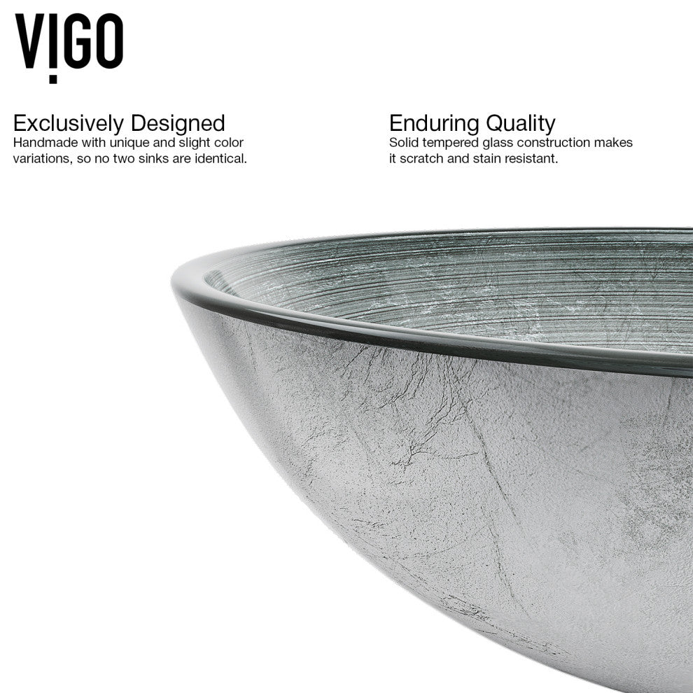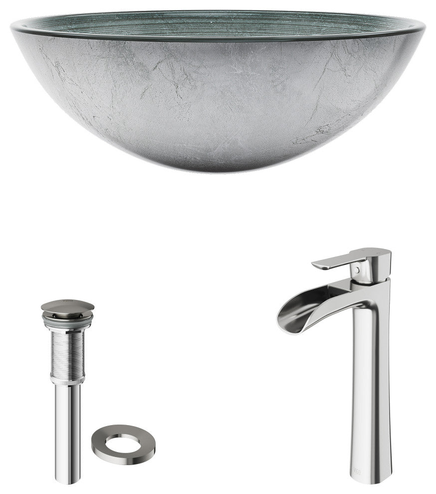 Brush away your woes with the VIGO Simply Silver Glass Vessel Bathroom Sink Set with the Niko Vessel Faucet. The sink features a unique paint-brushed design with a texturized exterior and a polished interior. Perfectly paired with this sink is the VIGO Niko Vessel Bathroom Faucet. The faucet, with its trough-style spout, sends water directly into the vessel bowl where a complementary matching pop-up drains excess water. Enjoy the beauty of simplicity with this bathroom sink set.