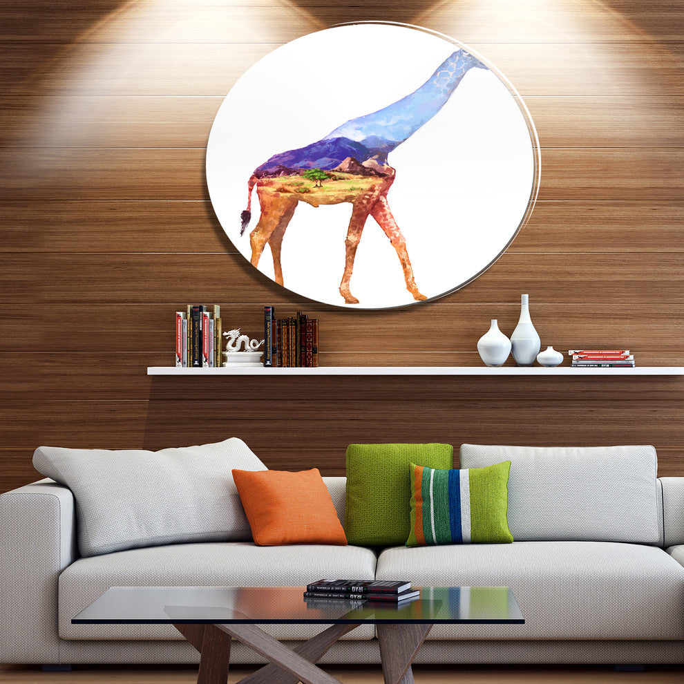 Bring Contemporary Abstraction to your home with this large Circle Metal wall art. This Giraffe Double Exposure Illustration Metal Artwork makes it the focal point of any room or office.