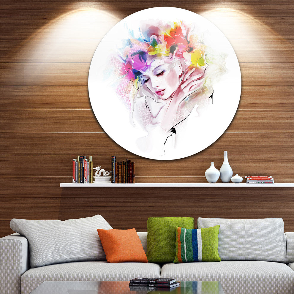 Girl With Flowers Wreath, Portrait Digital Art Disc Metal Artwork, 11"