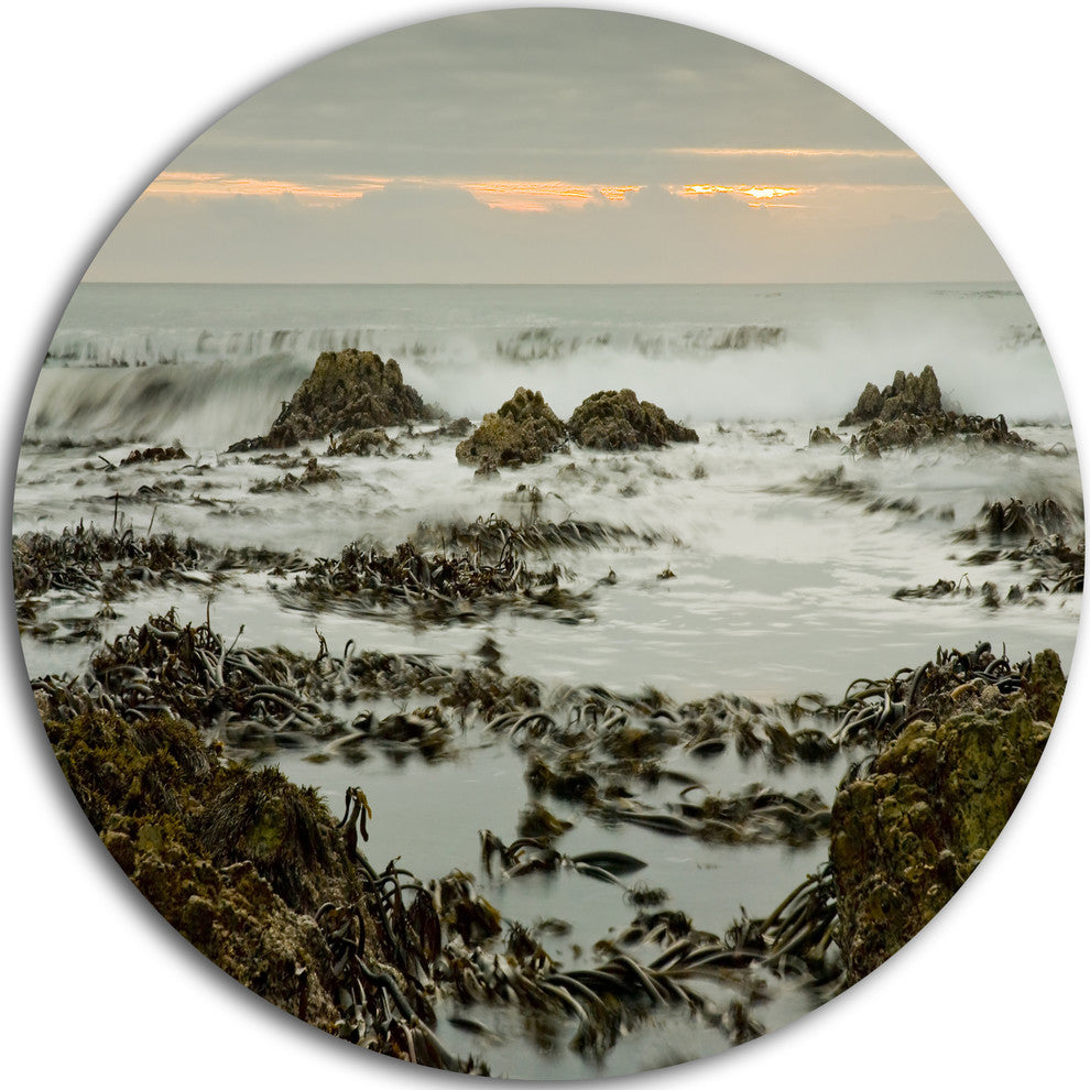 Bring Contemporary Abstraction to your home with this large Circle Metal wall art. This Gloomy Sunset over Rocks and Waves Metal Artwork makes it the focal point of any room or office.
