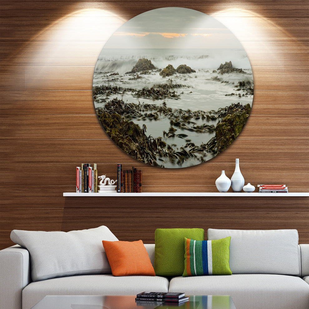 Bring Contemporary Abstraction to your home with this large Circle Metal wall art. This Gloomy Sunset over Rocks and Waves Metal Artwork makes it the focal point of any room or office.
