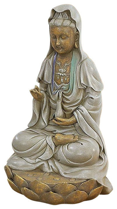 From atop a seat of fragrant lotus flowers, our legendary Asian bodhisattva in flowing white robe welcomes all in need of comfort. A serene work for home or garden, our Toscano exclusive in designer resin is awash in beautifully muted shades of green, lavender, faux bronze and stone. 7.5"Wx6.5"Dx12"H. 2 lbs.