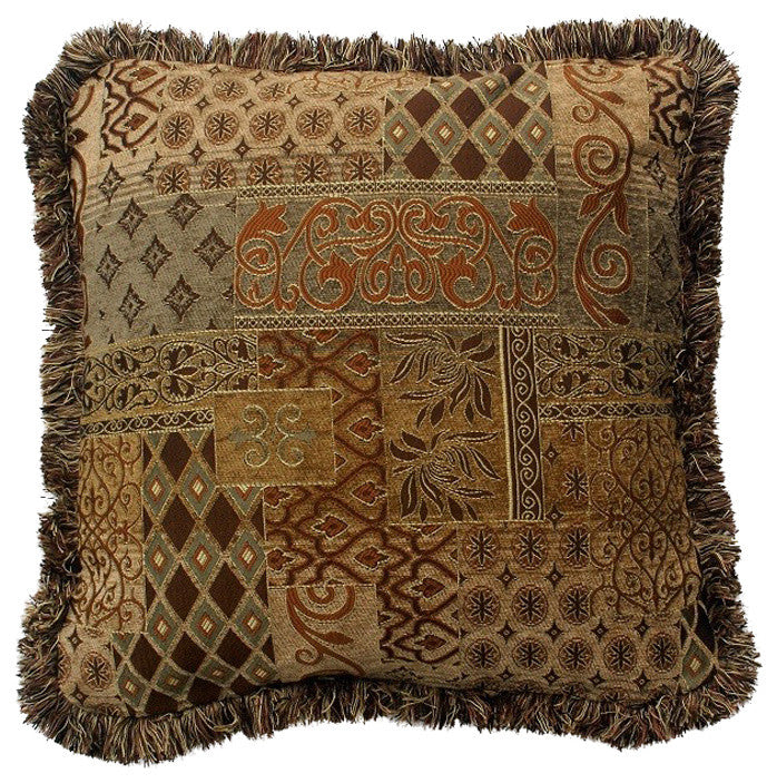 This fine embroidered transitional woven design on chenille is perfect for todays modern look. So versatile it works in Moroccan, modern and transitional decors. Made in rich tones of gold metallic, copper and bronze in a patchwork of modern and traditional textile designs. It has a plush variegated matching gold fringe. The fabric is a heavy upholstery grade chenille and has the same print on both sides. Complete pillow with hidden zipper and soft polyester fiber filled inserts. Available in 4 sizes.