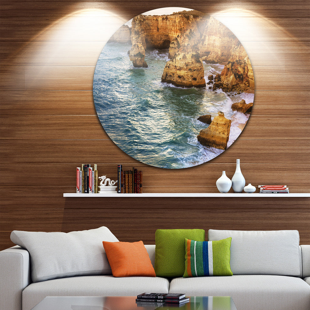 Golden Rocks And Beach At Algarve, Seashore Disc Metal Wall Art, 23"