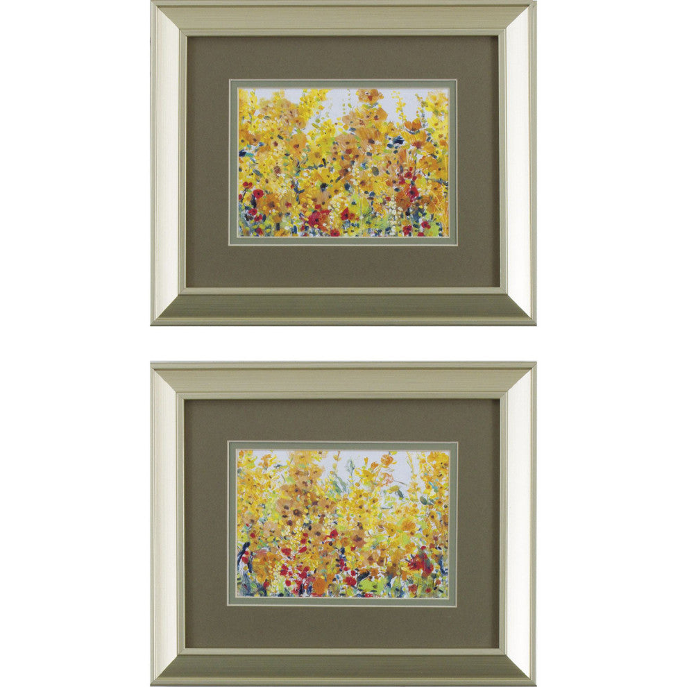 A set of golden floral prints that have been double matted and framed under glass in a complimenting gold frame.