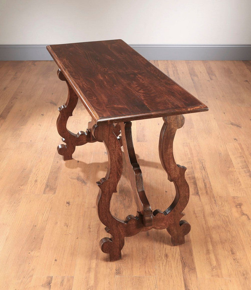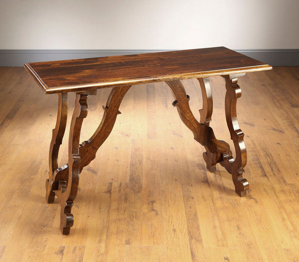 Brimming with early design aesthetics is the Goodrum Console Table. It is made from solid acacia wood construction boasting its natural, organic beauty. It''s a trestle table with lyre-shaped legs'' an accent detail that is used on early Italian furniture. The table is a versatile piece, and can be placed in your living areas or foyers for accent.Features:Overall product dimensions are 47.5" W x 20" D x 32" HConstructed from solid acacia woodTrestle table with lyre-shaped legsBrims with traditional and early Italian aestheticsAvailable in multiple color variationsDimensions:Console TableAssembled Product: 47.5 inches wide x 20 inches deep x 32 inches highWeight Capacity: 100 pounds
