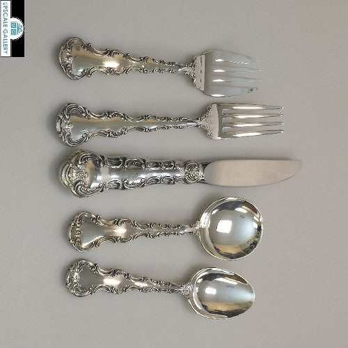 This classic sterling silver pattern was introduced in 1897, and is evocative of the Rococo style. The pleasing scrolls extending around the tines and bowls strikes a delicate balance with the stately shell design. This 5 piece place setting includes a place knife 9", place fork 7.5", salad fork 6.75", cream soup spoon 6" and a teaspoon 6". All items are brand new, never used.