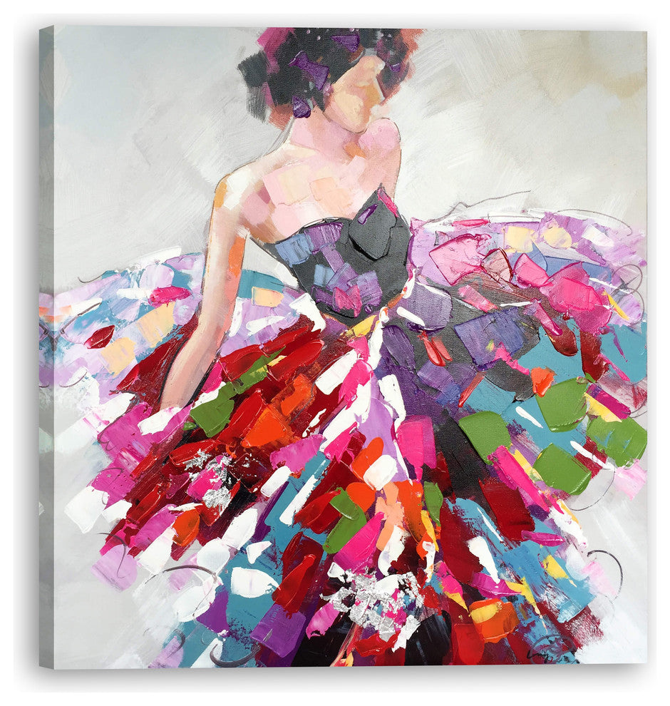 Experience the beauty of modern abstract art with "Graceful Colorful Dress," a stunning hand-painted oil painting. Using a bold and skillful technique, the artist creates a subtle yet powerful figure of a woman with smooth lines and large pieces of paint applied with a painting knife. The dynamic capture of the woman''s movement and the use of vibrant colors make this artwork stand out. The combination of softness and roughness in the painting showcases the artist''s unique intention.This rare and one-of-a-kind oil painting is perfect for any room in your home. It adds an element of surprise and a touch of elegance to your space, making it a great conversation starter. Whether you''re an art lover or a designer looking for a statement piece, this oil painting is worth adding to your collection.Crafted with 100% hand-painted oil paints on canvas and stretched over a 1.5-inch thick wood frame, this artwork is of the highest quality and built to last. Hang it up in your living room, bedroom, entryway, or any other space to enjoy an extraordinary artistic experience.
