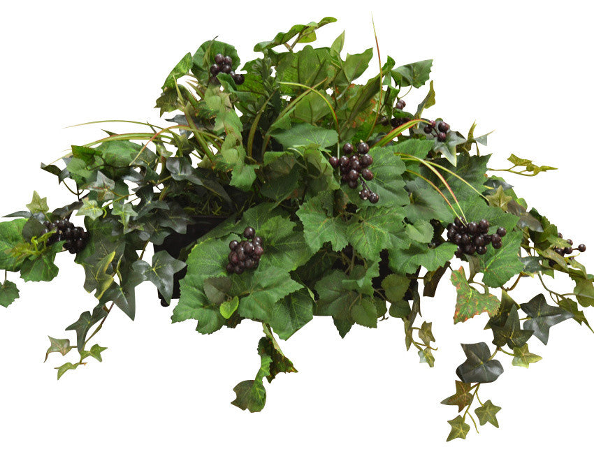 Grape ivy and Jamaican ivy blend to create this vibrant ledge plant display. Deep red hydrangea and dark grape clusters complement the large silk green leaves, which drapes over a Decorative ledge plant container. This mixed faux floral, grape and ivy arrangement measures 13" H X 15" D X 29" W .Features:-Grape Ivy mixed with hydrangeas-High Quality Lush Greenery-Custom Made in the USA
