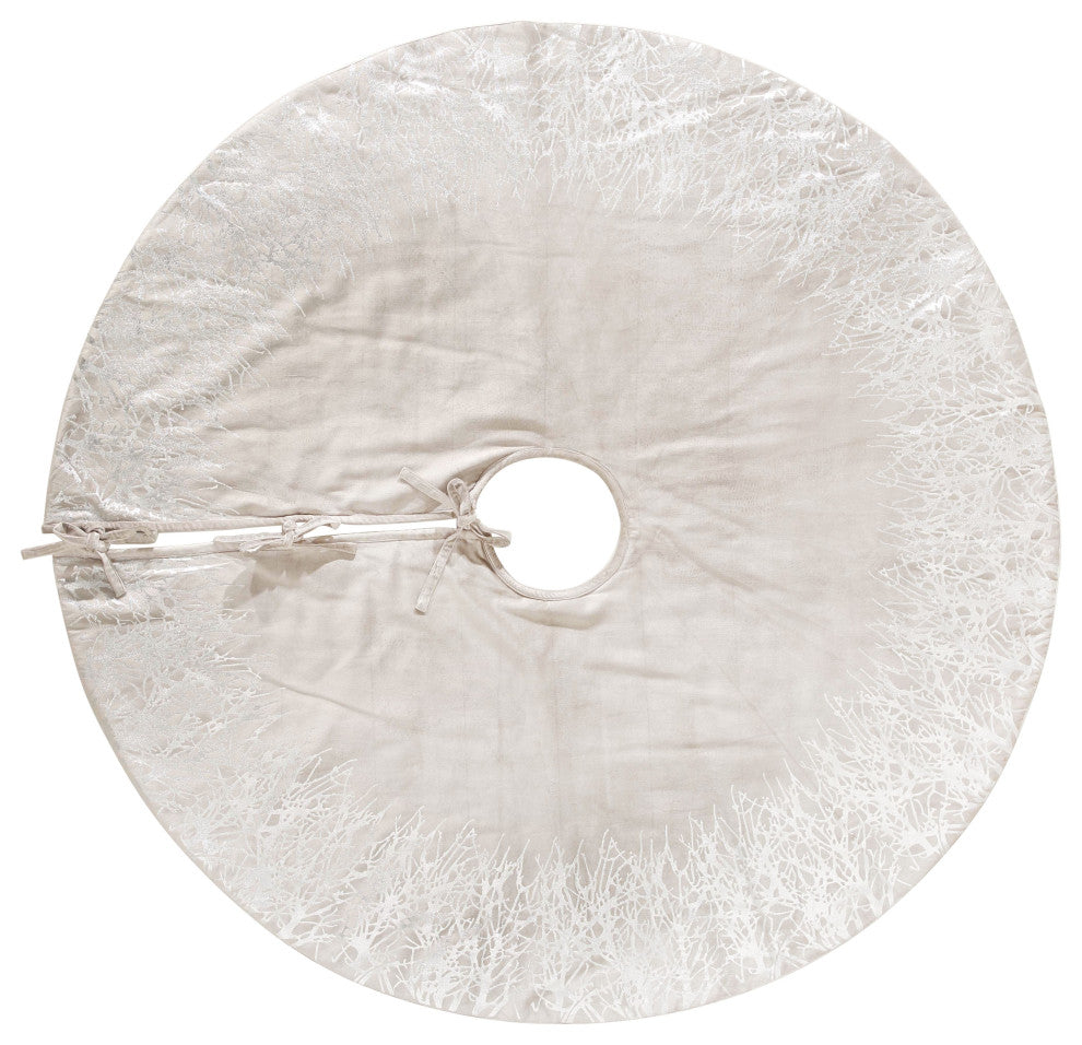 A showstopper. Printed foil forms an icy silver border, which forms a halo around your tree from below. The velvet shines. Thick tie closures will keep it securely in place this Christmas and for many more to come. 60" diameter. Center hole: 8" Cotton viscose. By purchasing this design, you are joining our efforts to support artisans worldwide. As handmade pieces, each Arcadia Home design is as unique as the artisan who created it.