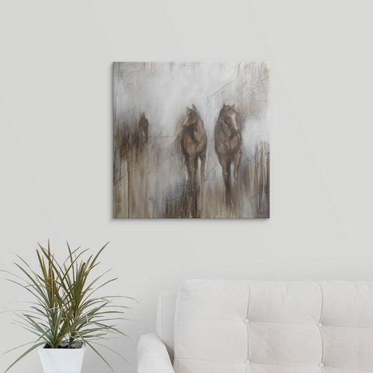 Gallery-wrapped canvas entitled, "Grazing II".Artwork of three horses grazing together in a field of brown on an early foggy morning.Our wrapped canvases feature a proprietary design that prevents warping or sagging over time. By using archival inks and artist-grade canvas, our premium canvases are sure to add that extra touch to any space. Lastly, our canvases are finished with a closed back that incorporates pre-installed hanging hardware for easy installation.