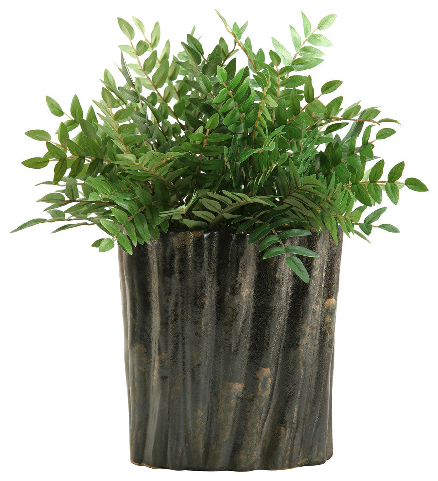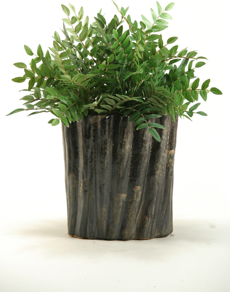 Faux bark colored ceramic oval planter filled with glossy green airy locust foliage.
