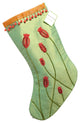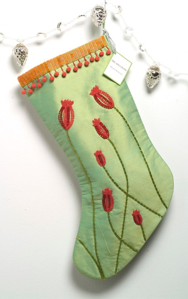 Lovely green silk stocking with hand beaded poppies and detailing. Floral and fun. Approximately 19". By purchasing this design, you are joining our efforts to support artisans worldwide. As handmade pieces, each Arcadia Home design is as unique as the artisan who created it.