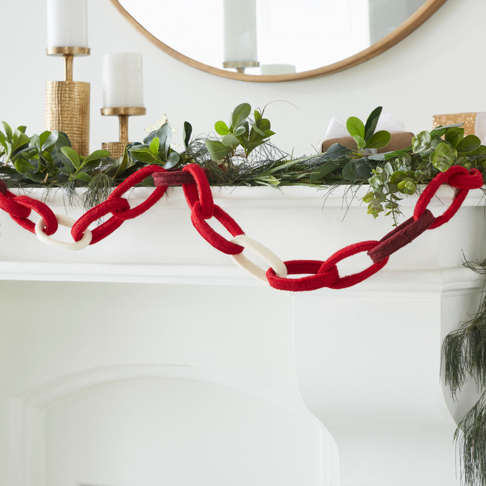 Reminiscent of the paper chains you used to make as a kid, this loop garland is a fun, sophisticated way to bring that sense of youthfulness to your holiday decor. Approximately 6 ft. long, finished with a glass-beaded loop. 100% sustainable wool felt.