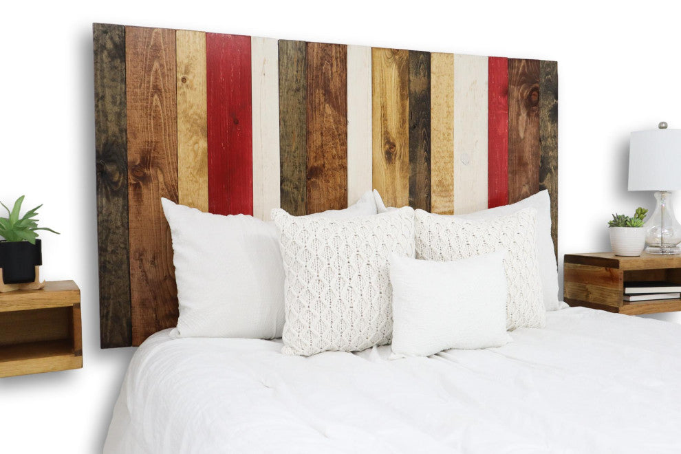 [Floating Panels] Built with individual panels that can be easily hung side by side onto the wall like a picture frame. They do not attach to a bed frame, as the height can be adjusted to your convenience.[Real Wood] A simple and beautiful minimalist handcrafted headboard made with real wood, creating a clean and clutter-free space that"™s perfect for relaxing and pleasing to the eye and mind. Boards are brushed-stain individually to give them a rustic look. Since it is real wood there will be some natural variations like knots or splits. These aren''t defects, but natural imperfections which add to the charm of your one of a kind table.[Durable & Sturdy Structure] Sealed with polycrylic for durability and watermark resistant. MADE IN GILBERT, ARIZONA.[Natural Wood Color] The Fall Mix design has a combination of stains and weathered colors which are: Dark Walnut, Honey, Golden Oak, Red, Whitewash. Each shiplap has the tendency to absorb the paint and stain differently, therefore the finish may slightly vary from the pictures on display.[DIMENSIONS] Number of panels included in this set: 3. Overall Dimensions: Length 64.5" x Width 2" x Height 36".