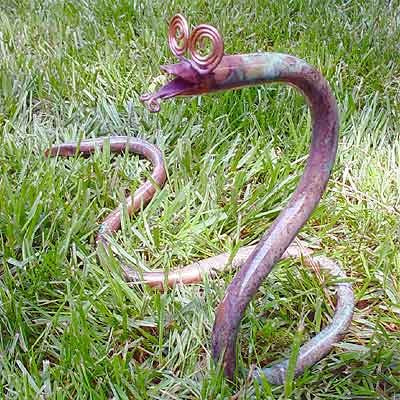 About the "Copper-Head" Garden Snake Now here''s a garden snake that will make you smile - not scream! Handcrafted in North Carolina, each silly snake is created from copper tubing with the addition of large copper eyes and tongue. The sculpture is finished with a beautifully aged patina and coated in a glossy UV-resistant coating for outdoor use. Due to the handcrafted nature of this item, the shape of each snake body will vary slightly.Handcrafted in the USAProduct Size : 10" high x 11" wide x 14" long (will vary slightly) Material : copper