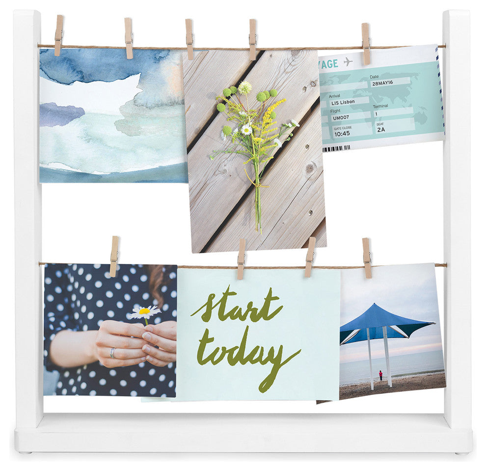 -Wood desktop photo display with 2 rows of clotheslines and 9 clips to hold photos and mementos.
