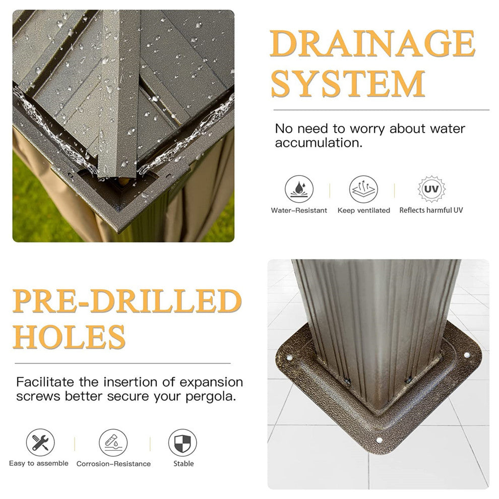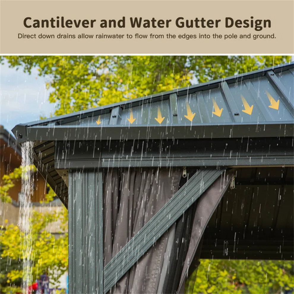EXCELLENT WATER GUTTER: The water gutter design collects the surface water of the roof directs it to four corners, and then flows along the pillars, The unique and targeted design keeps the gazebo in good condition and prolongs its lifespan.