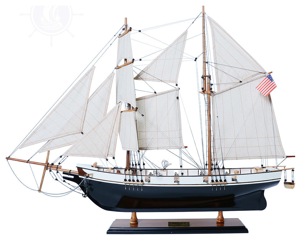 This is a high-quality, FULLY ASSEMBLED replica of the clipper that sailed out of the port of Galveston, Texas, in the mid-1800s. Master craftsmen using historical photographs, drawings or original plans meticulously handcraft these highly detailed wood models from scratch. They are built to scale with high-grade wood such as: western red cedar, rosewood, and mahogany. They are 100% hand built individually using plank-on-frame construction method and are similar to the building of actual ships. Each model requires hundreds of hours to finish and must go through a demanding quality control process before leaving the workshop. This beautiful Harvey model features: two tone painted black and white colors on the hull, plank on frame, and two decks. The front bowsprit and three large masts are connected securely using advanced rigging and lines painstakingly knotted and fastened by hand. Each yard has an attached hand-stitched unfurled sails made of fine linen. Metal anchors and a wooden rudder are visible on the front and rear of the ship. On the deck, there are metal stationed cannons, wooden windlass, bell tower, and many other spectacular ornaments. This model comes standard with a solid wood base and brass nameplate. It''ll make a perfect gift for home or office decorator, boat enthusiast or passionate collector.
