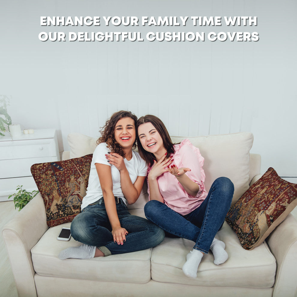 Hearing II Lady and the Unicorn Belgian tapestry cushion cover is one of the six tapestries in the "Lady and the Unicorn" series. This tapestry represents the sense of hearing.The lady plays a positive organ on top of a table covered with a Turkish rug. Her maidservant stands to the opposite side, and holds the organ in place. The lion and unicorn once again frame the scene holding up the pennants, but in this scene, their positions are reversed so that they are inside the frame, and each is on the opposite the side of the lady that they are on in all the other tapestries.