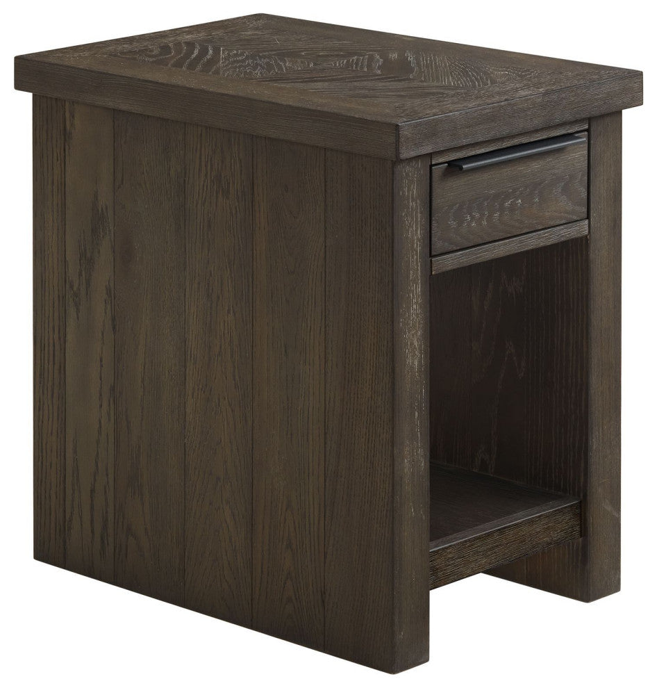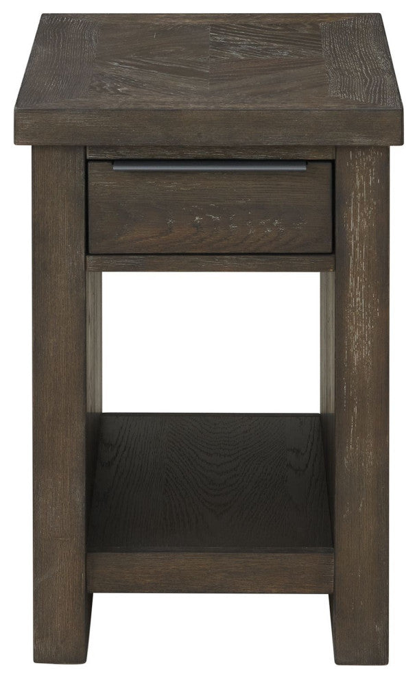 The Hearst Chairside Table is a beautiful and versatile accent piece that will add character to any room. Crafted from select hardwoods, oak veneer, and a reverse diamond pattern table top that is lightly wire brushed with light saw mark accents, this table will stand out in any home. With an open shelf for storage or display space, you can easily keep items within reach without compromising on style. The reclaimed chevron finish gives the piece a rustic charm that will look great in any setting. It is solidly constructed with an extra thick tops and heavy duty bases. The hardware is finished in an antique iron color.FeaturesOverall product dimensions are 16" W x 24" D x 24" HOak veneer and select hardwoods provide lasting durabilityTable top lightly wire brushed with light saw mark accents for added dimensionTable top features a reverse diamond pattern for visually appealing textureOpen shelf offers convenient storage or display spaceIntercon was established in 1976 and has become an industry leader in designing, marketing and manufacturing wood dining, bedroom and home entertainment furniture. It has been a family owned and operated business for over forty years. Our design and warehouse capabilities allow us to be a leading provider of furniture throughout the United States and Canada. It is our mission to offer our customers superior quality products with lasting value.