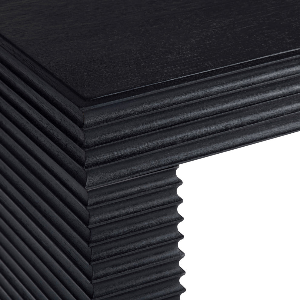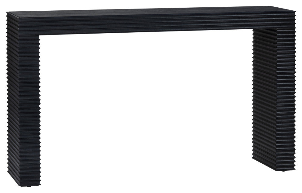 This sleek console and sofa table combines modern design with functionality, making it a perfect addition to any space. Crafted from durable wood, it features a bold black finish that exudes contemporary elegance. The table''s standout design lies in its ribbed body, offering a textured and visually striking look. Equipped with floor levelers for stability, it ensures a secure fit on uneven surfaces. Assembly is required, but the timeless style and practicality make it well worth the effort