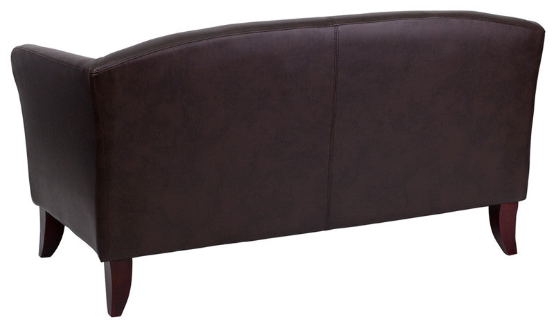 Your lobby or reception area is the forefront of your business and providing distinguished and comfortable seating is the first step towards making a great impression. The modern appeal of this loveseat will make a lasting impression with your visitors. The contemporary design of this furniture adapts in several different settings. This loveseat features streamlined stitching and elevated, curved hardwood feet. Not only will this chair fit in a professional environment, but will add a modern look to your home. [111-2-BN-GG]• Contemporary Style• Brown LeatherSoft Upholstery• Sloping Arms• Slightly Curved Back and Seat• Fixed Seat Cushion• 1.8 High Density Foam• CA117 Fire Retardant Foam• Hardwood Frame Construction• Cherry Stained Wood Feet• LeatherSoft is leather and polyurethane for added Softness and Durability• Seat-Size:42"W x 20"D• Back Size:40"W x 13"H• Arm-Height From Floor:26"H• Arm-Height From Seat:9"H• Seat Height:19"H• Assembly Required:Yes• Manufacturer Color:Brown• Data Mapping Color:Brown• Finish:Cherry Wood• Upholstery:Brown Bonded Leather• Back Material:Leather/Faux Leather• Not Adjustable• Not Adjustable Arms• Residential Use• Not reversable• No Under Seat Storage• Back Color:Brown• Seat Color:Brown• Frame Color:Wood GrainOverall Dimension:52"Wx29"Dx29"H