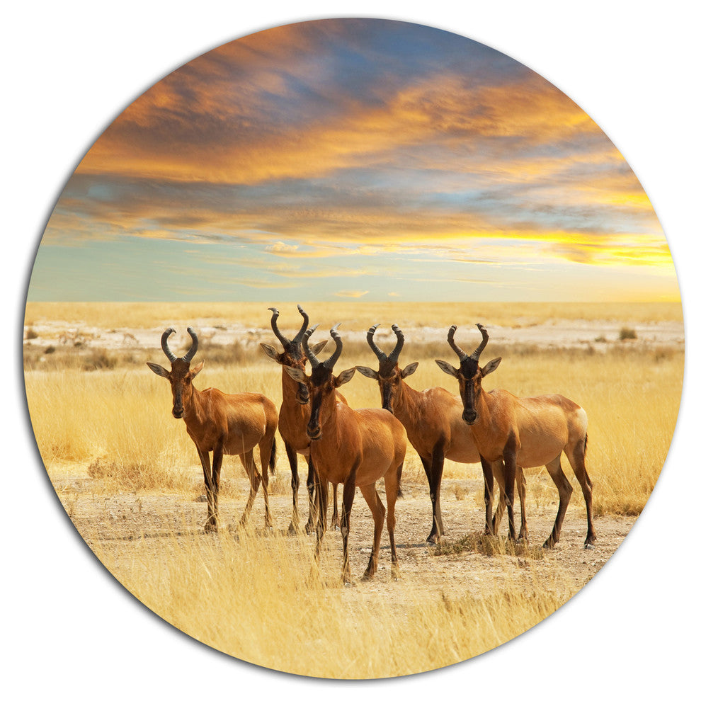 Herd Of Antelope In Grassland, African Disc Metal Artwork, 36"