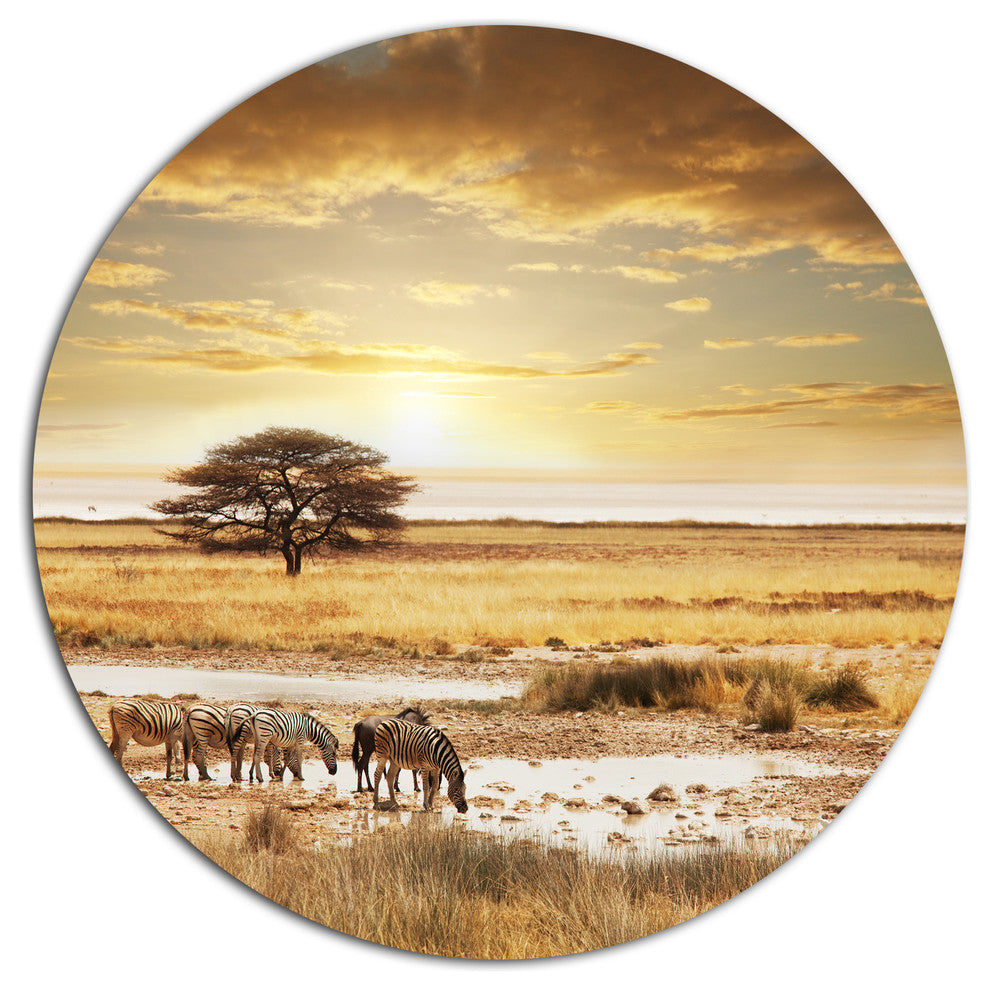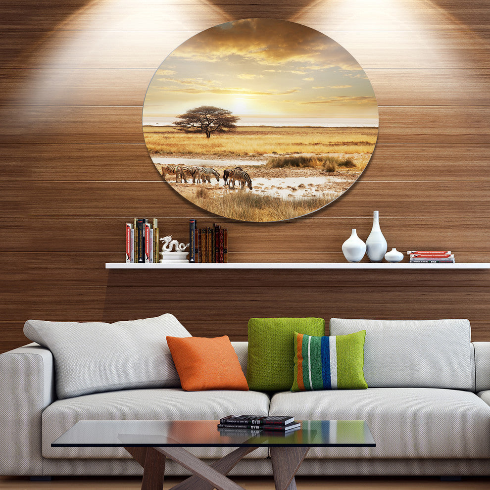 Bring Contemporary Abstraction to your home with this large Circle Metal wall art. This Herd of Zebras Drinking Water Metal Artwork makes it the focal point of any room or office.