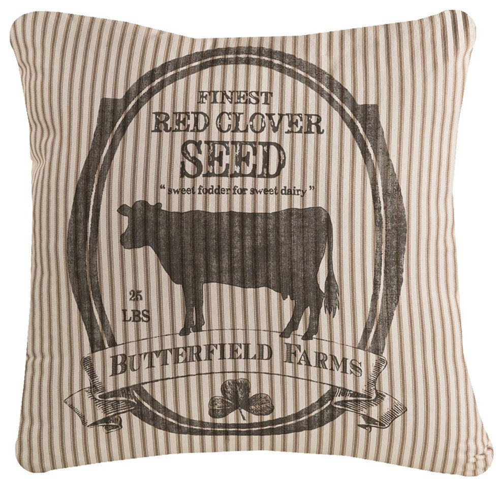 Add a little rustic charm to your farmhouse decor with our Butterfield pillow. Inspired by vintage grain sacks used to store seeds, this pillow will add comfort to any room. The screen-printed Butterfield Farms logo declares "sweet fodder for sweet dairy" and appears against a ticking stripe cover.