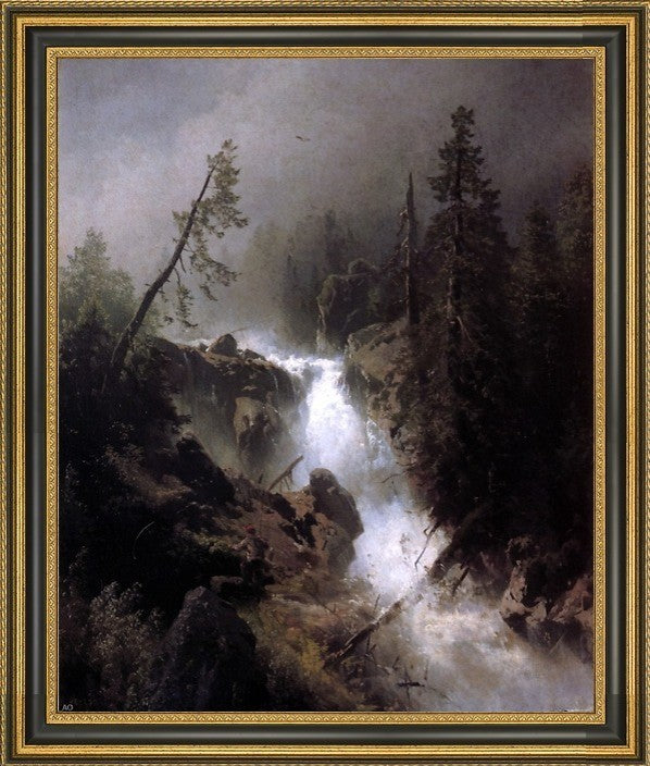 16" x 20" Herman Herzog Cascade with a Fisherman framed premium canvas print reproduced to meet museum quality standards. Our Museum quality canvas prints are produced using high-precision print technology for a more accurate reproduction printed on high quality canvas with fade-resistant, archival inks. Our progressive business model allows us to offer works of art to you at the best wholesale pricing, significantly less than art gallery prices, affordable to all. This artwork is hand stretched onto wooden stretcher bars, then mounted into our 3 3/4" wide gold finish frame with black panel by one of our expert framers. Our framed canvas print comes with hardware, ready to hang on your wall. We present a comprehensive collection of exceptional canvas art reproductions by Herman Herzog.