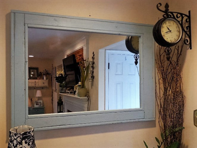 Give any room in your home charm with this handmade reclaimed styled wood mirror. The wood has been given new life sanded and restored. It now it deserves a place to rest holding a mirror for your family and friends to enjoy for years to come. This is our thick bottom version, made to mimic the look of a window with a thicker bottom edge. Each side is 4 inches thick except for the bottom piece which is 5 inches. Our mirrors are built by hand in our wood shop in Warrington, PA. Dimensions:30"(w) x 24"(h)36"(w) x 30"(h)42"(w) x 30"(h) Details:Built with premium knotty pine wood, first quality mirror glass, screwed on saw tooth hangers are attached for easy hanging on any wall.Do you want a different color, this item is available in over 19 colors; Cloudy Sky Blue is shown in the main image.Note: Each mirror will look slightly different in color and character as the pieces of wood are unique.Each Mirror is made with High Quality 1/4 mirrored glass. At Lane of Lenore we breathe life into old items to give them a new purpose. All of our items are refurbished parts we''ve come across over the years and are handmade for you to use and display in your own home. Lane of Lenore is a collection of handcrafted mirrors and items created from reclaimed materials. From mirrors made from 100+ year old windows, to shelving made from 200+ year old lumber Lane of Lenore finds ways to create a historic, yet artistic style for your home.