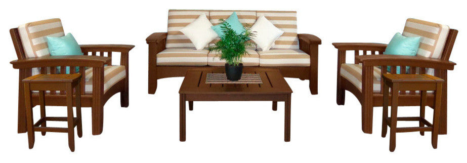 Has your outdoor furniture flopped? Switch up your seating arrangement with the Hershy Way Patio Set. Easily accommodating five guests, this conversation set is perfect for entertaining. Each frame is crafted from cypress wood and assembled with stainless steel hardware, while the deep cushions are constructed from weatherproof Sunbrella fabric. Comfortable, durable and chic, the Hershy Way offers the seating solution your patio needs.Cushion color shown in second image6-piece mission-style patio setIncludes 1 sofa, 2 chairs, 2 accent tables and 1 coffee tableMade in the U.S.Deep cushionsWeather-resistant Sunbrella cushionsNon-absorbent cushion fill5-year cushion warrantyCurved armsSteel hardwareFrame finish: UV-resistant brown paintCushion color: Sun ray stripeFrame materials: CypressChair dimensions: W 32" x D 36" x H 35"Sofa dimensions: W 79" x D 36" x H 35"Accent table dimensions: W 15.5" x D 17.5" x H 24.5"Coffee table dimensions: W 32" x D 36" x H 16"