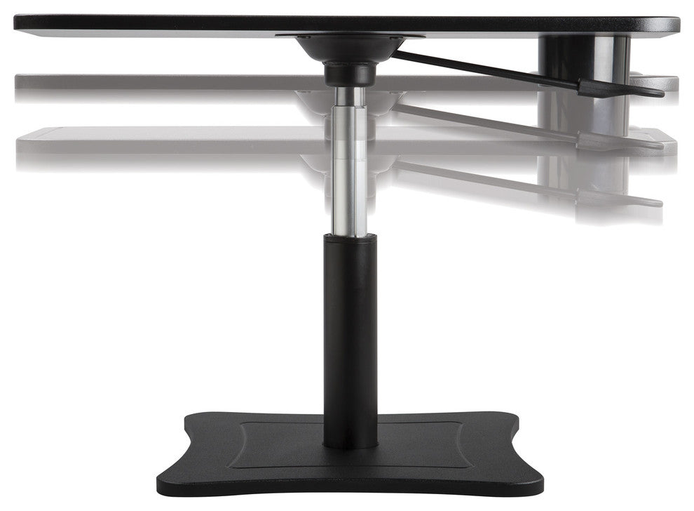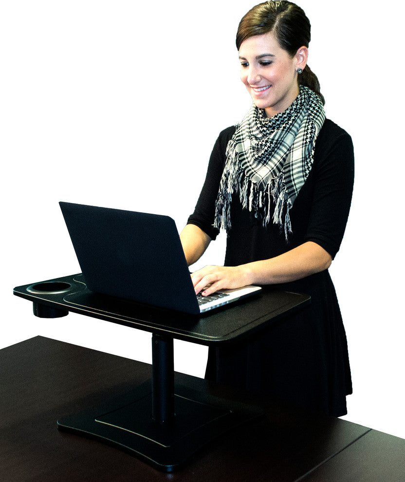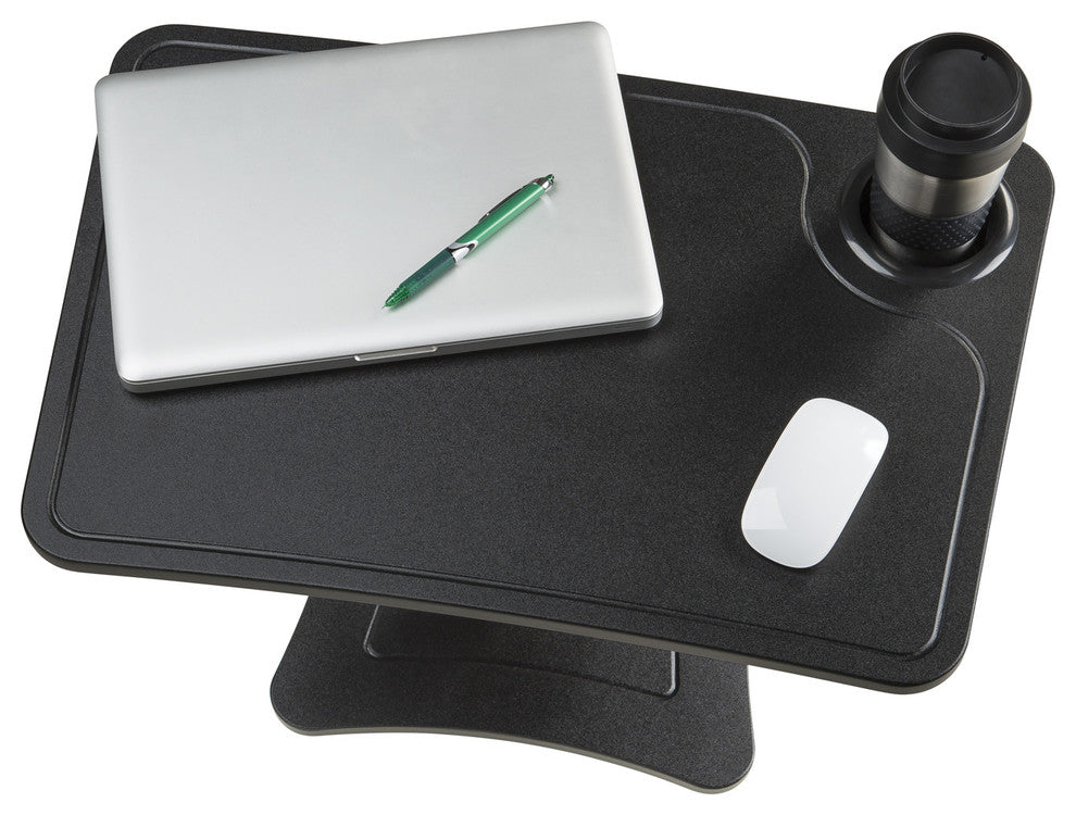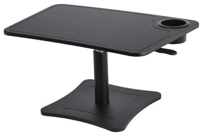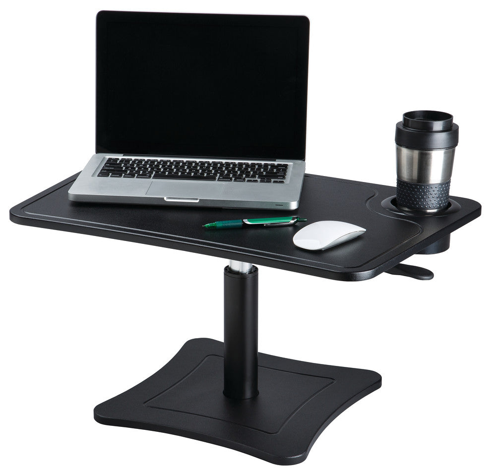 The High Rise Height Adjustable Laptop Stand with Storage Cup creates a functional, standing workspace for your laptop or tablet. With a surface that is 23.75" wide by 15.25" deep, a standard laptop can be accommodated with space allotted for a wireless mouse or other desk top accessories. Made of wood, the work surface is durable with scratch resistant PVC coating. The 3.25" diameter storage cup is convenient for pens, pencils, smartphones or beverages, putting all your necessities within arm''s reach. The heavy-duty steel piston allows for height adjustments from 12" to 15" above the desk. Note: Does not lower to a sitting position. Weighing 10.25lbs, this product allows for easy set-up and relocation. The High Rise Height Adjustable Laptop Stand with Storage Cup creates a standing workspace for a laptop or tablet. 23.75in. W x 15.25in. L x 12-15in.