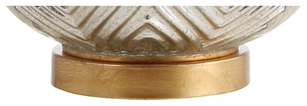 Bring contemporary elegance home in this textured silver gourd lamp with a midcentury peacock texture on the base. Featuring two bulbs for maximum light and a pull chain on/off switch for each, the top is finished with a tapered empire shade made from cotton. Ambient light seen through the shade illuminates your residence or office, while creating a beautiful reflection off the mercury-glass inspired base. Mixed metals is one of the hottest trends this market season, and the pairing of brass fittings with the silver glass is the perfect way to register fashion in your home.Features:• Mixing a mercury silver with brass gold, the blended metallic of this gourd table lamp are built to shine • 100% cotton hardback drum shade• Beautiful to display or easy to conceal: the 60" cord is silk-wrapped• On-off chain switch on socket• Eco-friendly 9W LED bulb included• Takes two bulbs and compatible with any 9W LED 60W TYPE "A" 13W CFL• UL Listed • Color: Mercury Silver with white shade• Body Material: Glass/Metal• Base Material: Metal• Finial Material: Plastic• Finial Color: Gold Leaf• Harp Color: Gold• Includes: One (1) lamp(s)• Minor Assembly RequiredDimensions:• Lamp: 30.75 inches high x 18 inches wide x 18 inches deep• Shade: 11 inches high x 18 inches wide x 18 inches deepAbout us:You see a lamp.We see a decorative work of art.A perfectly curved shade casts a dramatic shadow on a floor. A silk cord you never want to hide. LED lightbulbs: as easy on the environment as they are on the eyes. The JONATHAN Y Lighting collection considers every detail from impeccably sourced materials to designer styling. And our prices are so attractive, we''ve transformed a functional necessity into a fashion accessory.JONATHAN Y Lighting - a fashion revolution in home decor.