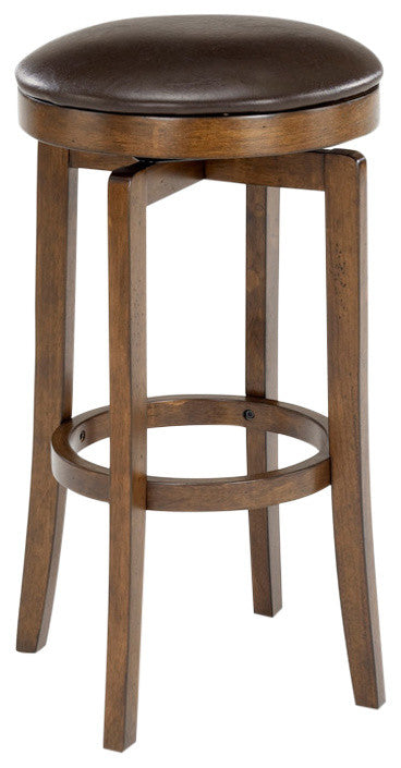 Simple and versatile, the Hillsdale Furniture Brendan Backless Swivel Bar Height Stool has a Brown Cherry wood finish and Brown faux leather upholstery that blends seamlessly with most décor. Its padded seat and 360° swivel functionality make this bar height stool comfortable and convenient -- while the perfectly placed footrest makes it easy to relax and reinforces the structural integrity of the swivel wood stool. Ideal for kitchen islands and bar-height dining tables. Assembly required.