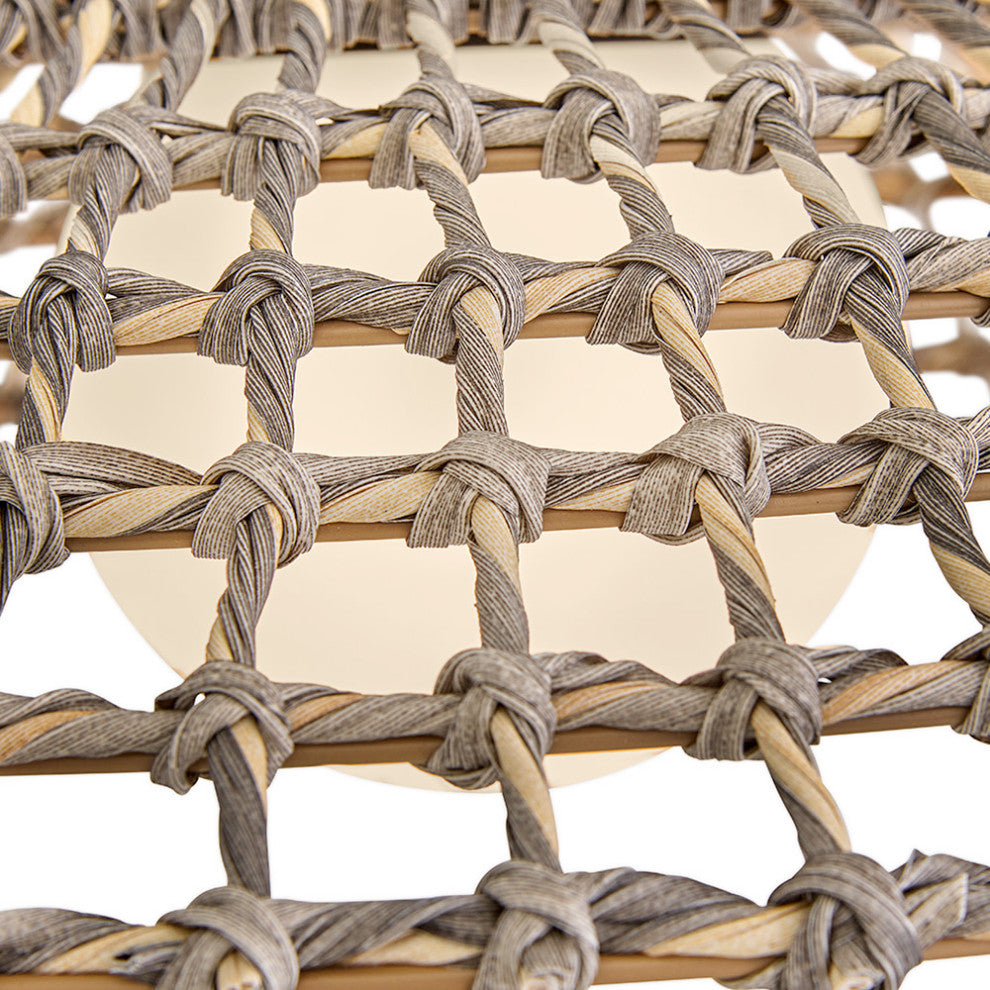 Cool and coastal-inspired, Arlen features a woven, all-weather rattan shade perfect for entertaining in al fresco dining spaces. The natural texture and neutral tones are complemented by a chic black canopy.