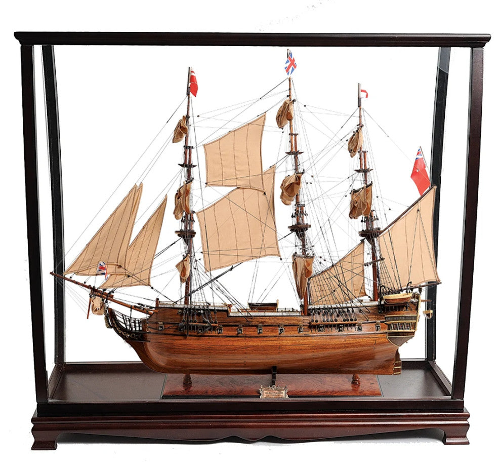 Are you looking for a perfect display combination? Our HMS Surprise 37 model and tabletop display case combo will sure to set your home or office apart! The Model: Our spectacular HMS Surprise model is handcrafted from beautiful wood such as rosewood, mahogany, teak, and along with various other exotic wood. The hull is constructed using a plank on frame method, each strip of exotic wood are carefully joined together to form a smooth hull. This model is completely hand built to spec by skillful and creative master craftsmen; you will be amazed at how real it looks. The ship has a clear varnished coating follow with amazing details. On the ship, you can come across incredible features such as wooden bowsprit, foremast, mainmast, and mizzen mast. They are all connected to numerous full-size fabric sails with detailed stitching, all rigging are painstakingly fastened by hand in matching colors. On the main deck, you will come across 2 wooden boats situated in a large rectangular area with 2 wooden bunkers, a wooden/metal steering wheel, and a wooden bunker with a telescope. On the poop deck, there''s navigational area with 2 metal steering wheels for the captain and 1 wooden cabin. There are metal railings surrounding the beak deck area toward the quarter deck area. You can easily spot 2 rows of numerous metal cannons on both side of the hull. In addition, you will find supplementary crafted metal parts on the ship such as anchors, lantern, statues, and much more...There''s also a wooden rudder held with metal to help the ship maneuver in the right direction. An attached wooden stand with a nameplate engraved HMS Surprise 1794 is standard on this model. Our model was built according to scale through original plans, pictures, and drawings. We absolutely use no plastic parts only the highest quality wood and metal parts. Our HMS Surprise model comes fully-assembled and ready to be displayed. The Display Case: This beautiful tabletop display case was made out of hardwood and painted in dark mahogany color. It has distinctive designs that add elegance and beauty when displayed in your home or office. It is 100% fully assembled and comes with plexiglass panels on all sides. It features the curves on the sides of the case which enable it to accommodate models with wide yards. This case is very effective when it comes to preventing dust particles as well as keeping your valuable tall ship looking new and protected at all time. It is a must-have for model ship enthusiasts or passionate collectors. Purchase this combo and save now on both item and shipping cost. Notes: Both items will be shipped safely together on a wood pallet via Ground freight. Video instruction on how to put the model into the display case is available via YouTube.