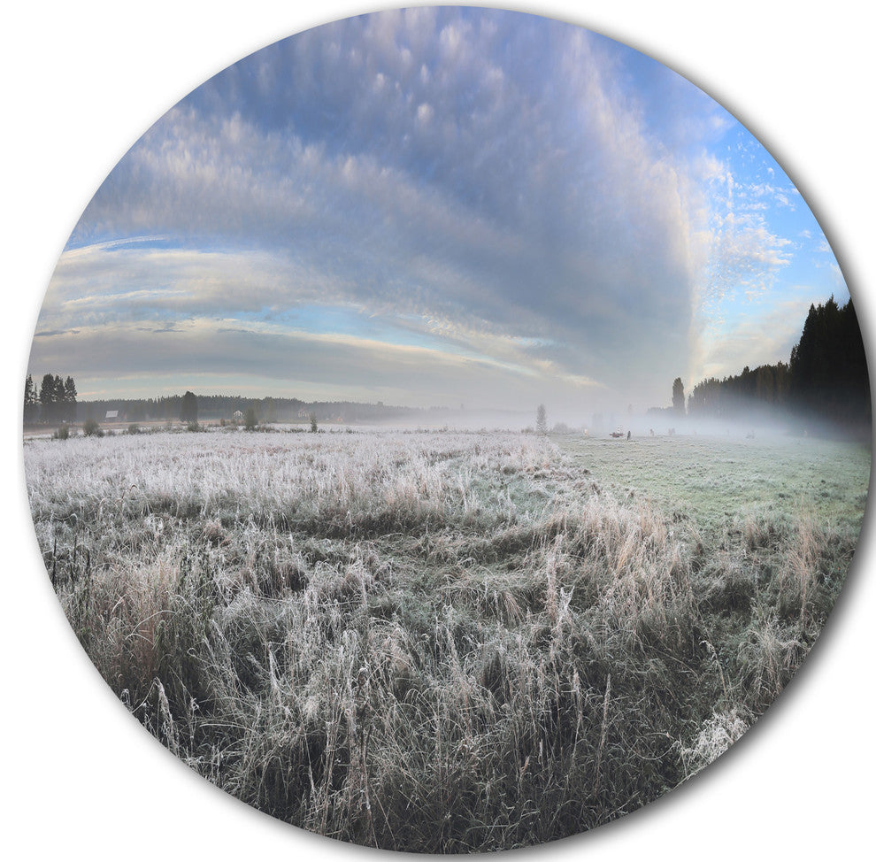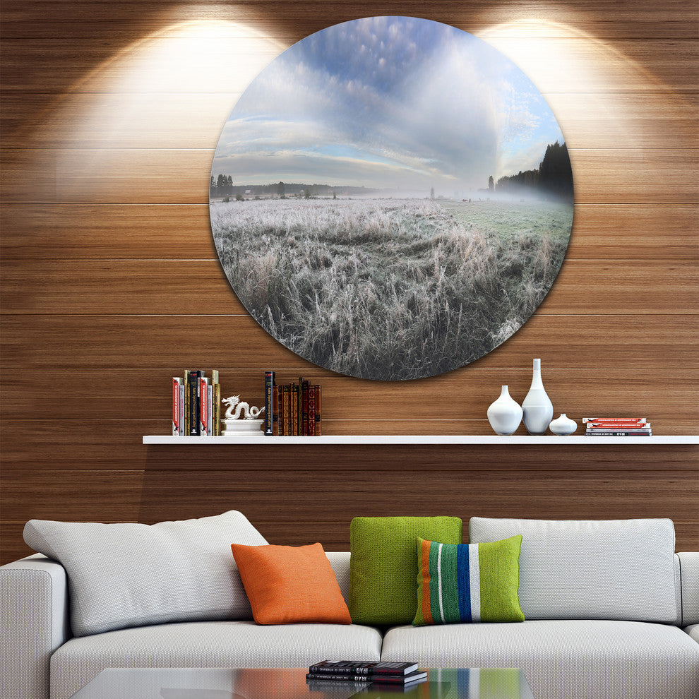 Bring Contemporary Abstraction to your home with this large Circle Metal wall art. This Hoarfrost on Grass under Cloudy Sky Metal Artwork makes it the focal point of any room or office.