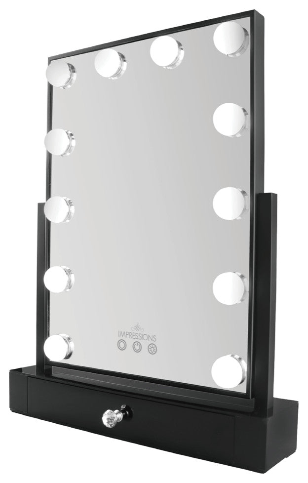 Impressions Vanity Hollywood Tri tone XL makeup mirror brings Hollywood glamour and functionality to your vanity space. Equipped with built in long lasting LED Lights around the mirror for even lighting. Tap the Power button to power it on or off. Tap the light color button to switch between cool white, natural, and warm light tones. Hold the light bulb button down to adjust brightness.