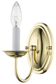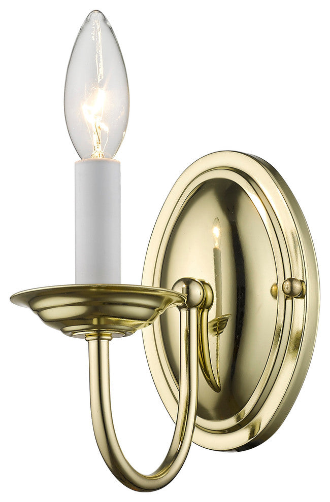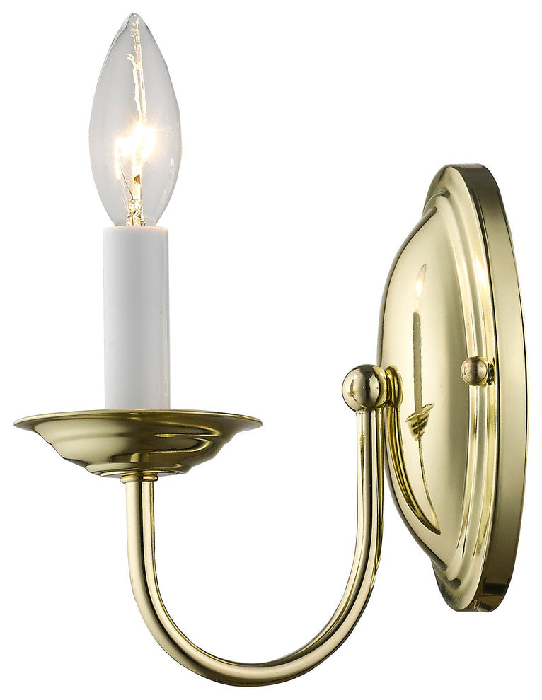 This one light wall sconce from the Home Basics collection is an alluring reflection of traditional style. The elegant sweeping arm and polished brass finish are beautiful details that unite for a breathtaking piece.Finish: Polished BrassMaterial: SteelNumber of Bulbs: 1Bulb Base Type: Candelabra BaseMax Wattage: 60Backplate Size: 4"W x 6"HExtension: 6.5"Suitable for Dry Locations? YesSuitable for Damp Locations? YesSuitable for Wet Locations? NoADA Compliant? No