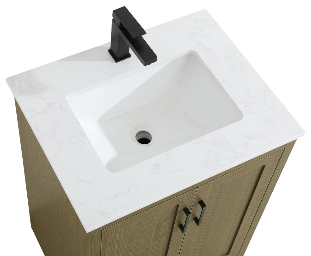 Redefine your bathroom with this transitional shaker-style vanity, designed to combine practicality with timeless aesthetics. Its clean lines and shaker-style door panels create a versatile look that complements both traditional and contemporary spaces. The engineered marble countertop, featuring a unique faux marbled pattern, adds a sophisticated focal point, while the integrated porcelain sink ensures durability and easy maintenance. The vanity includes a shelf with a smart U-shaped cutout, optimizing storage while accommodating plumbing. Crafted from sturdy MDF with a warm woodgrain finish, it brings a natural and inviting feel to your bathroom. Equipped with adjustable foot levelers for stability and a pre-drilled faucet hole for quick installation, this compact vanity delivers on both style and function. Best of all, it arrives fully assembled, ready to enhance your space right out of the box.