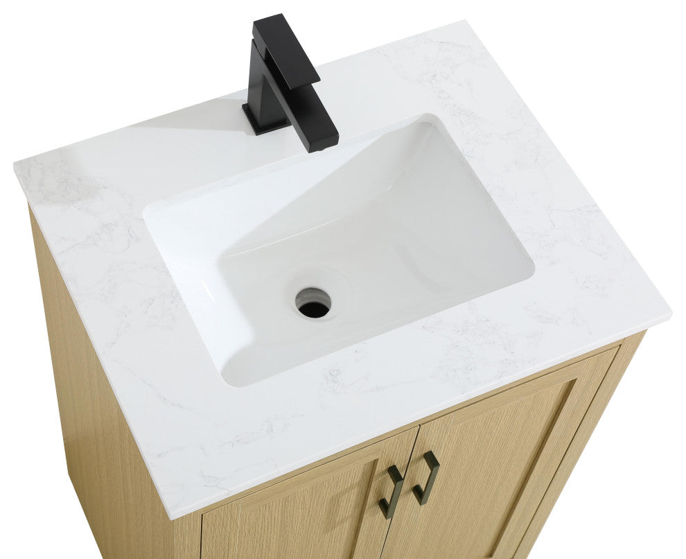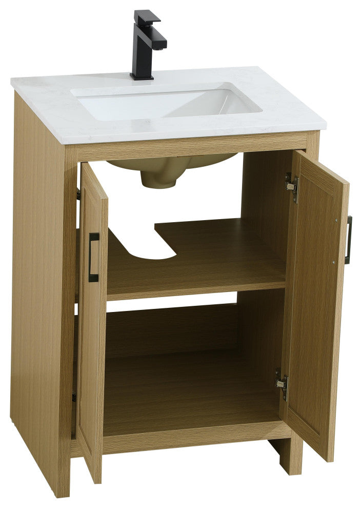 Redefine your bathroom with this transitional shaker-style vanity, designed to combine practicality with timeless aesthetics. Its clean lines and shaker-style door panels create a versatile look that complements both traditional and contemporary spaces. The engineered marble countertop, featuring a unique faux marbled pattern, adds a sophisticated focal point, while the integrated porcelain sink ensures durability and easy maintenance. The vanity includes a shelf with a smart U-shaped cutout, optimizing storage while accommodating plumbing. Crafted from sturdy MDF with a warm woodgrain finish, it brings a natural and inviting feel to your bathroom. Equipped with adjustable foot levelers for stability and a pre-drilled faucet hole for quick installation, this compact vanity delivers on both style and function. Best of all, it arrives fully assembled, ready to enhance your space right out of the box.