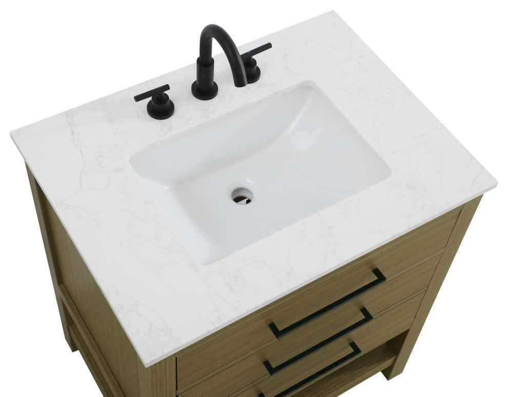 Elevate your bathroom design with this versatile and beautifully crafted bathroom vanity cabinet. The engineered marble top features striking veining, adding a luxurious focal point to your space. Built from premium solid wood and MDF, it ensures long-lasting durability and strength. The porcelain sink, complete with a concealed overflow, offers a seamless and refined finish.Available in four stunning finishes Chestnut Brown, Honey Brown, Mocha Brown, and White''this vanity suits any interior style. Designed with convenience in mind, it features soft-closing drawers with modern handles and a tip-out drawer for easy access to small essentials, keeping your space tidy. The bottom deep drawer mimics the appearance of two separate drawers, providing ample storage for larger items, while the open shelf at the base offers additional storage space for towels or decor.Fully assembled for your convenience, it includes foot levelers for stability on any surface. For a complete look, pair it with an optional matching backsplash, sold separately. UPC certified for quality assurance, this vanity is the perfect combination of functionality, style, and ease of use.