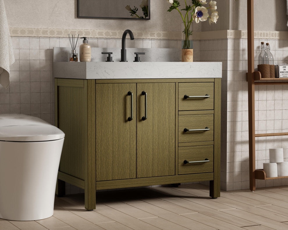 This bathroom vanity embodies a clean, minimalist design, perfectly suited for modern and transitional spaces. Its straight, sleek lines and flat-paneled doors create a refined yet approachable look. The warm, honey-toned finish highlights the subtle wood grain, adding visual interest while maintaining a sense of balance and simplicity. The vanity features a functional layout, with two cabinet doors on one side and three stacked drawers on the other, creating a balanced and organized look. Matte black hardware, including slim and cylindrical pulls, contrasts elegantly against the warm wood, reinforcing its contemporary vibe while providing subtle visual interest. The thick engineered marble countertop in crisp white adds a sharp contrast to the warm base, creating a visually dynamic combination that is both functional and stylish. This vanity is perfect for those seeking a design that combines modern simplicity with a touch of bold refinement. This vanity is delivered fully assembled and equipped with foot levelers for effortless installation and stability. Combining practicality and bold design, this vanity is UPC certified and ready to transform your bathroom space. The matching backsplash seamlessly integrates with the countertop, offering a cohesive design that protects walls from splashes while maintaining a unified look.
