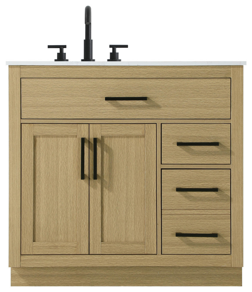 Introduce a perfect balance of functionality and style to your bathroom with this thoughtfully designed vanity. Constructed with a combination of solid wood and MDF, it offers durability and a sturdy build. The sleek engineered marble countertop with subtle grey marbling complements the rustic wood grain finish, creating a stylish and inviting centerpiece for your bathroom. Designed in a contemporary style with a transitional flair, it features a U-shaped shelf for seamless plumbing integration and multiple soft-close drawers for clutter-free organization. A pull-down drawer enhances convenience, while the toe kick adds a refined, clean-lined appearance and simplifies cleaning underneath. Matte black hardware contrasts beautifully with the cabinet finish, tying the look together. Delivered fully assembled and equipped with foot levelers, this vanity combines practicality and aesthetic appeal to suit modern and transitional bathrooms alike.