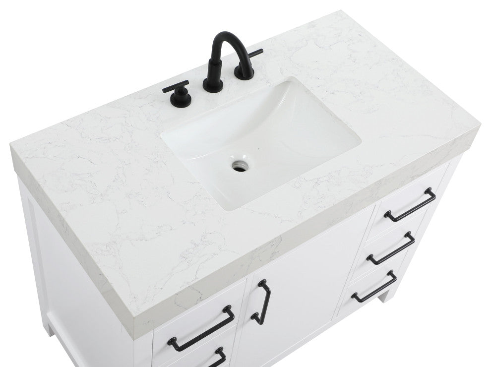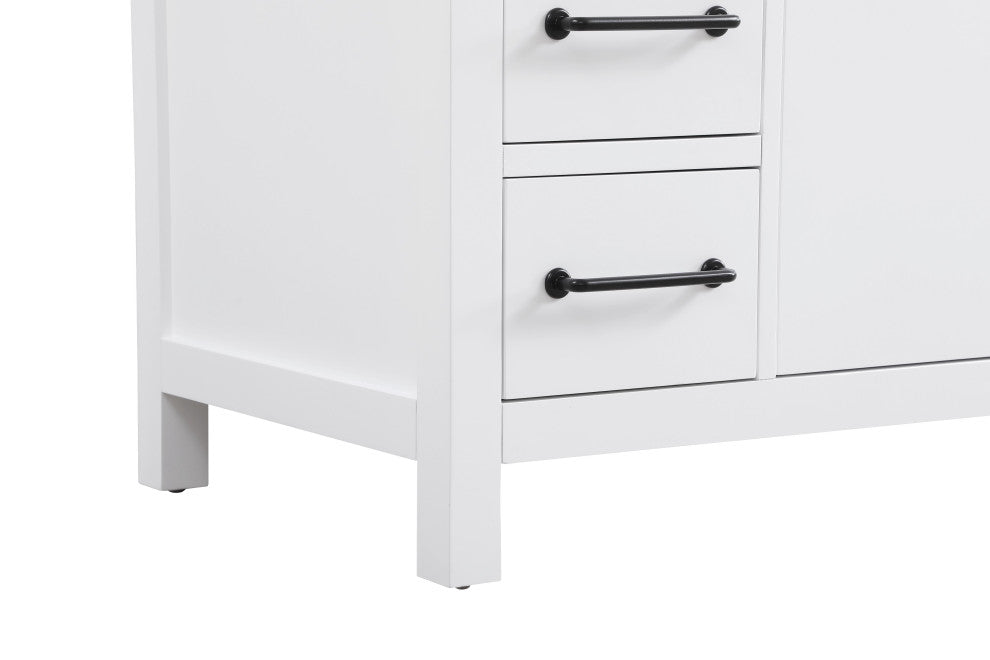 This bathroom vanity offers a clean-lined design, perfect for modern and minimalistic spaces. The bright white finish enhances the overall brightness of the room, creating a fresh and airy feel. Its structured design, featuring symmetrical drawers on either side and a centered door, adds balance and organization to the overall aesthetic. Matte black hardware, including slim and cylindrical pulls, contrasts elegantly against the white wood, reinforcing its contemporary vibe while providing subtle visual interest. The thick engineered marble countertop in crisp white adds a sharp contrast to the white base, creating a visually dynamic combination that is both functional and stylish. This vanity is perfect for those seeking a design that combines modern simplicity with a touch of bold refinement. This vanity is delivered fully assembled and equipped with foot levelers for effortless installation and stability. Combining practicality and bold design, this vanity is UPC certified and ready to transform your bathroom space. Complete the setup with an optional matching backsplash, sold separately.