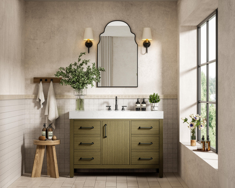 This bathroom vanity embodies a clean, minimalist design, perfectly suited for modern and transitional spaces. Its straight, sleek lines and flat-paneled doors create a refined yet approachable look. The warm, honey-toned finish highlights the subtle wood grain, adding visual interest while maintaining a sense of balance and simplicity. Its structured design, featuring symmetrical drawers on either side and a centered door, adds balance and organization to the overall aesthetic. Matte black hardware, including slim and cylindrical pulls, contrasts elegantly against the warm wood, reinforcing its contemporary vibe while providing subtle visual interest. The thick engineered marble countertop in crisp white adds a sharp contrast to the warm base, creating a visually dynamic combination that is both functional and stylish. This vanity is perfect for those seeking a design that combines modern simplicity with a touch of bold refinement. This vanity is delivered fully assembled and equipped with foot levelers for effortless installation and stability. Complete the setup with an optional matching backsplash, sold separately. Combining practicality and bold design, this vanity is UPC certified and ready to transform your bathroom space.