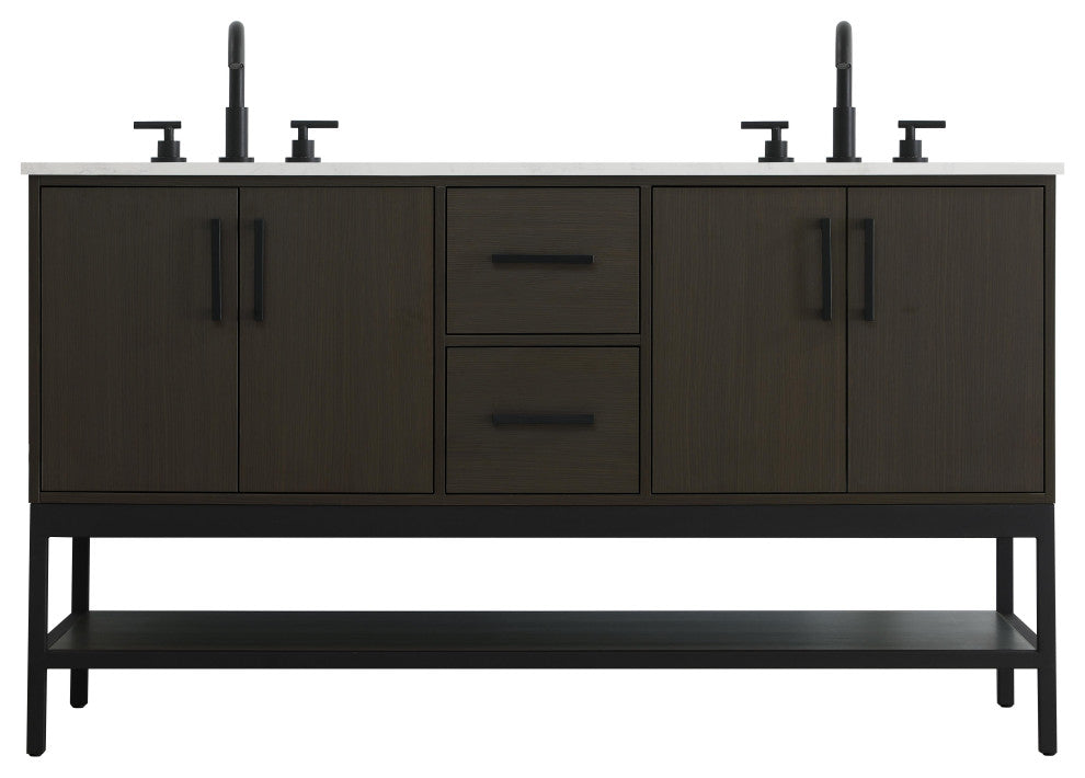 Upgrade your bathroom with this modern bathroom vanity that combines form and function effortlessly. Its sleek wood veneer cabinetry, paired with a bold black metal frame, brings a clean, contemporary vibe to any space. Designed with practicality in mind, this vanity offers soft-close drawers and cabinets to organize your essentials, as well as an open lower shelf for added storage or display. The durable white quartz countertop is built to withstand daily use, while the undermount ceramic sink ensures easy maintenance. Complete with matte black hardware and pre-drilled features for effortless installation, this vanity is the perfect centerpiece to refresh your bathroom with style and efficiency.