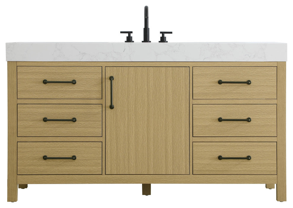 This bathroom vanity showcases a balanced blend of contemporary style and warm, natural-like elements, making it a versatile addition to various interior designs. The clean, straight edges and flat-panel doors lend a modern, streamlined look, while the soft, light wood finish highlights the faux grain pattern, adding warmth and a sense of organic texture to the piece. The central drawers and symmetrical cabinet doors create a sense of balance and structure. Matte black hardware offers a bold contrast to the light wood tone, reinforcing the modern aesthetic while maintaining a timeless appeal. The thick engineered marble countertop adds a sturdy, minimalist element, with its clean white surface further elevating the overall sophistication of the vanity. This piece is a perfect marriage of style and practicality, effortlessly complementing both modern and transitional bathroom designs. This vanity is delivered fully assembled and equipped with foot levelers for effortless installation and stability. Combining practicality and bold design, this vanity is UPC certified and ready to transform your bathroom space.
